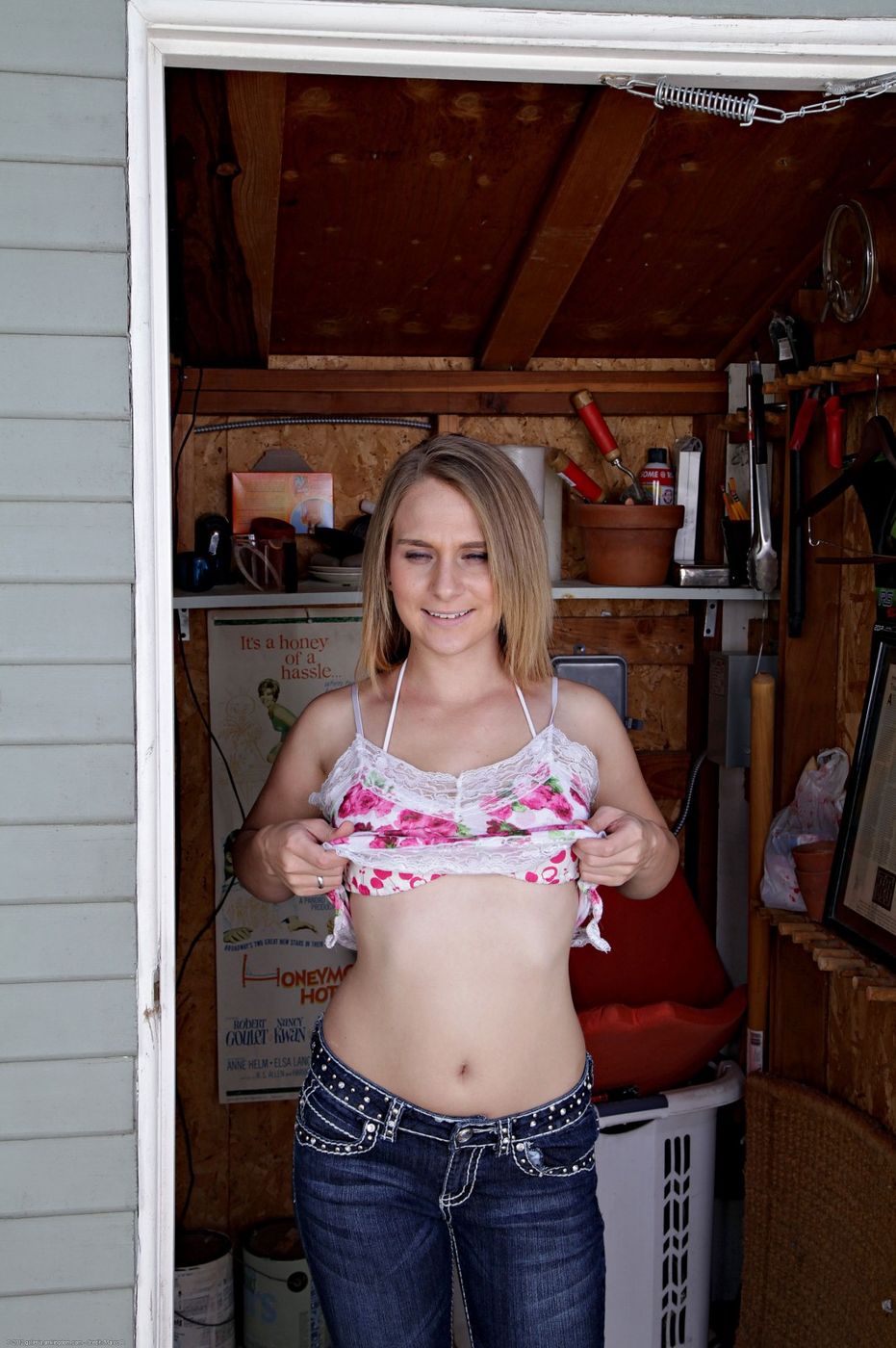 - Description: Abbie Anderson removes her clothing while taking pictures in front of a wooden fence outside.